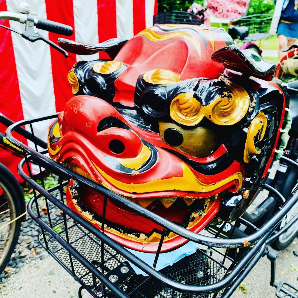 自転車カゴに獅子頭って 笑