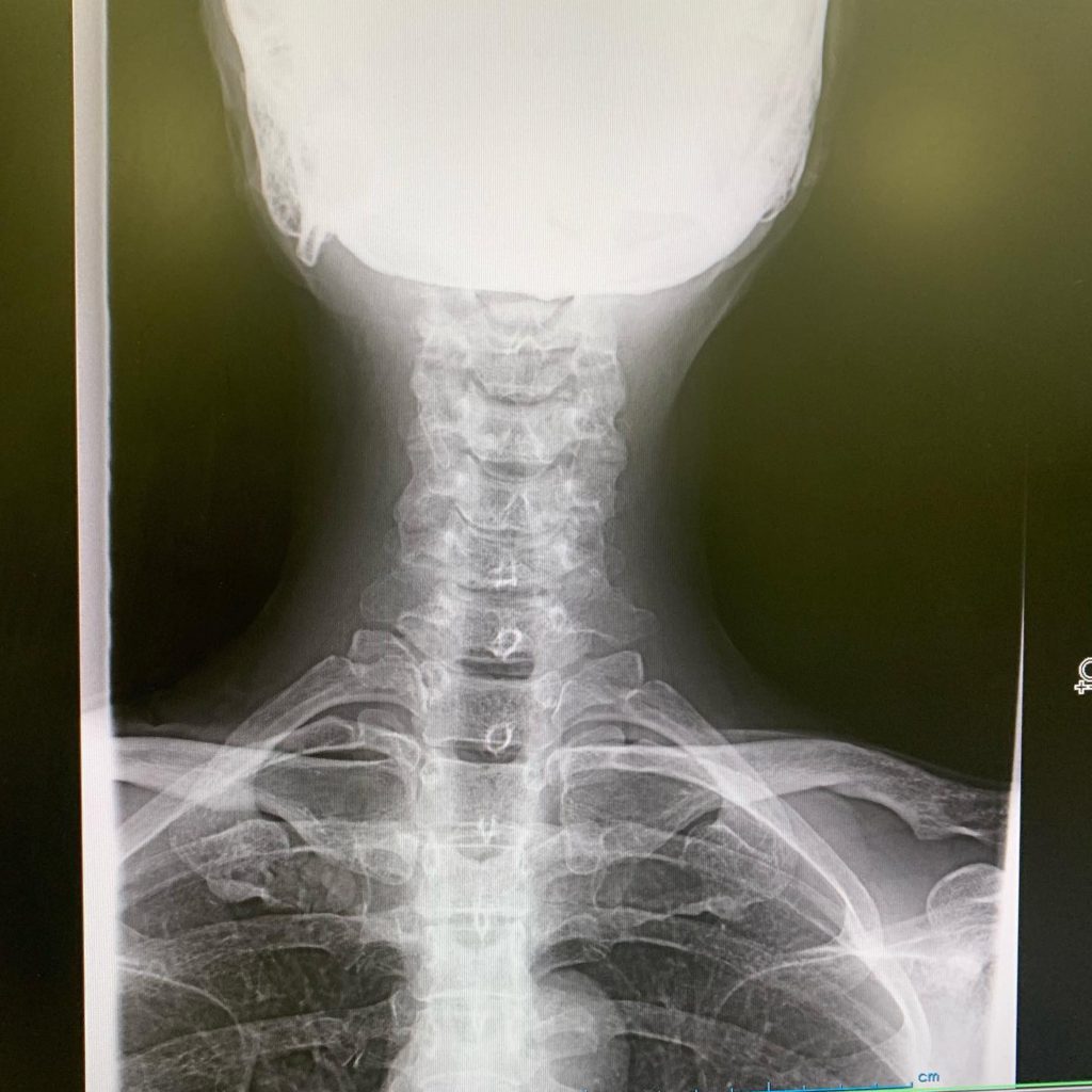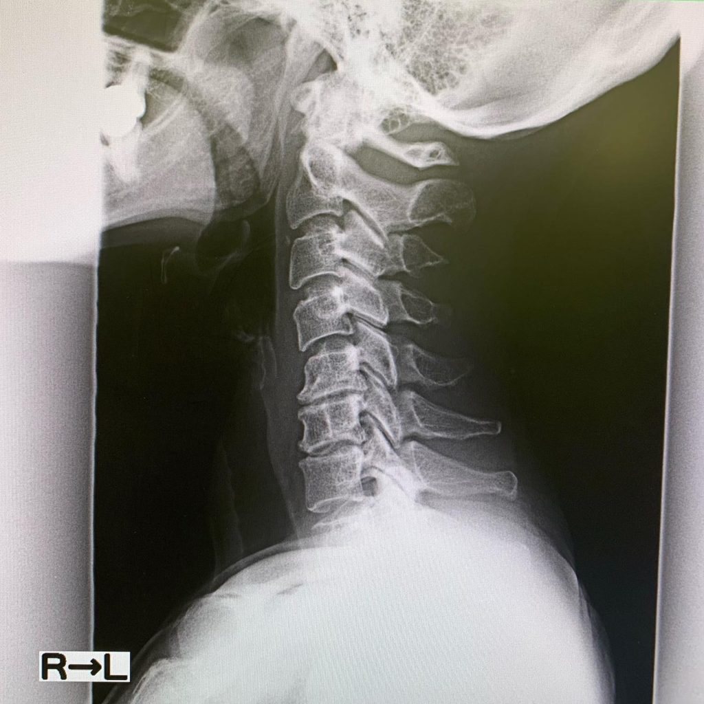 レントゲン撮ったら、首は真っ直ぐ過ぎるし、椎体は骨棘できて変形してるし、椎間板も減ってるし。