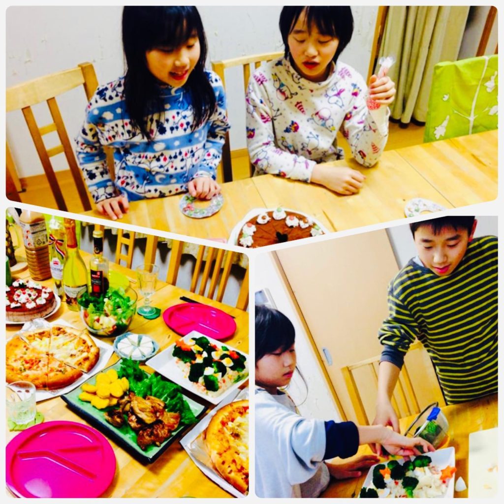 予約しておいたピザを夕方受け取りに行き、サラダとケーキを作り。