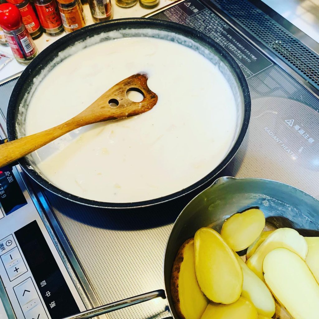 今日はホワイトソースを作ってポテトグラタン。