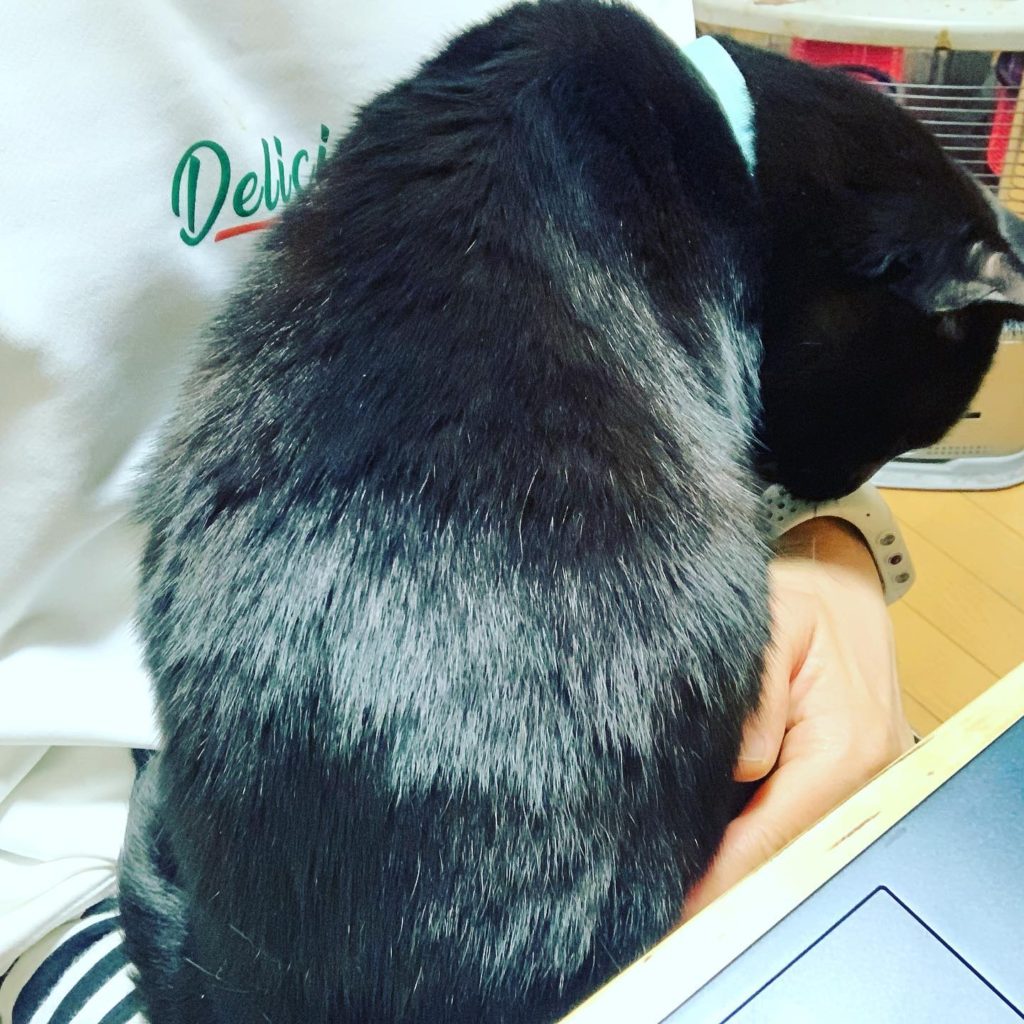 忙しい朝なのに、なんと初めてくろべぇが膝に乗ってきた😳