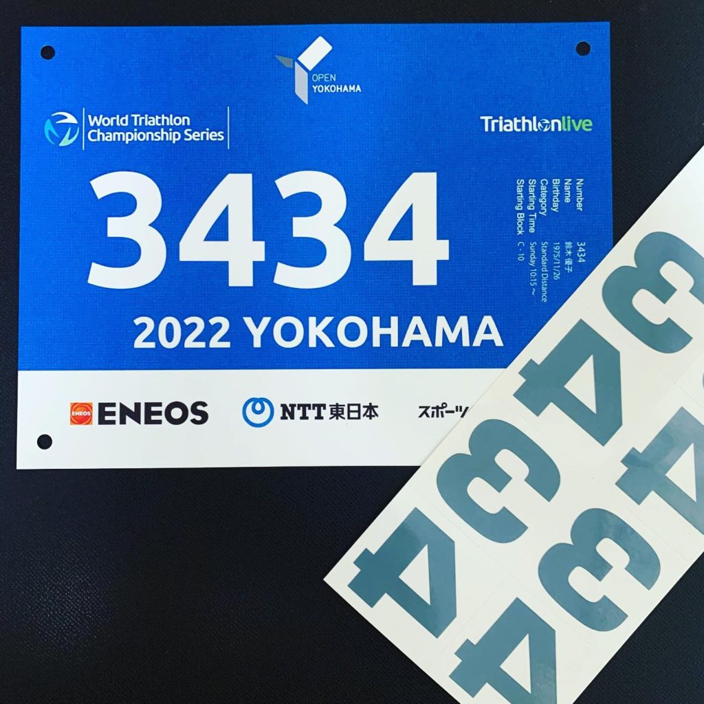 アシックスプレミアムトライアスロンプログラムの練習から帰宅したら、横浜トライアスロンのゼッケン等が届いていた😆✨