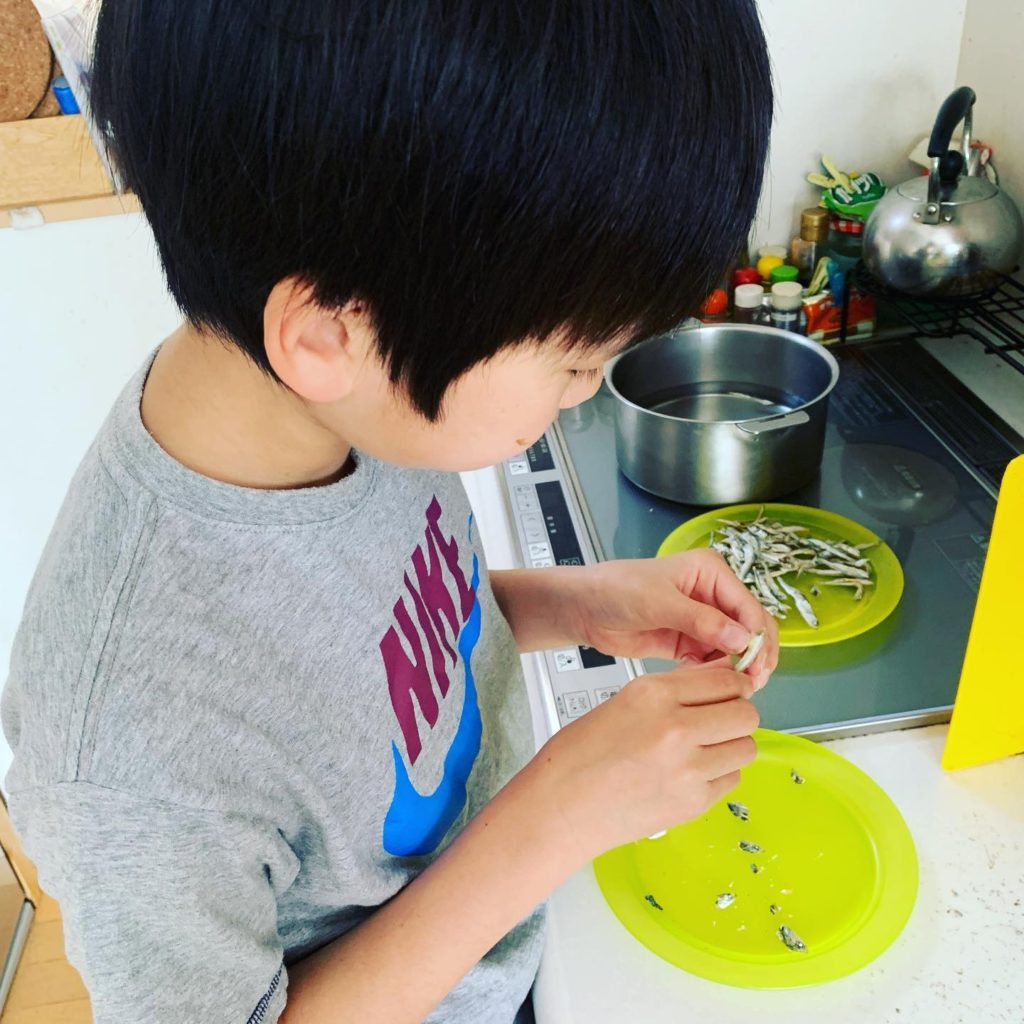 味噌汁作りからの流れで、エビの下処理の時も次男を台所に呼んで、エビの背ワタ取りを教えてあげた。