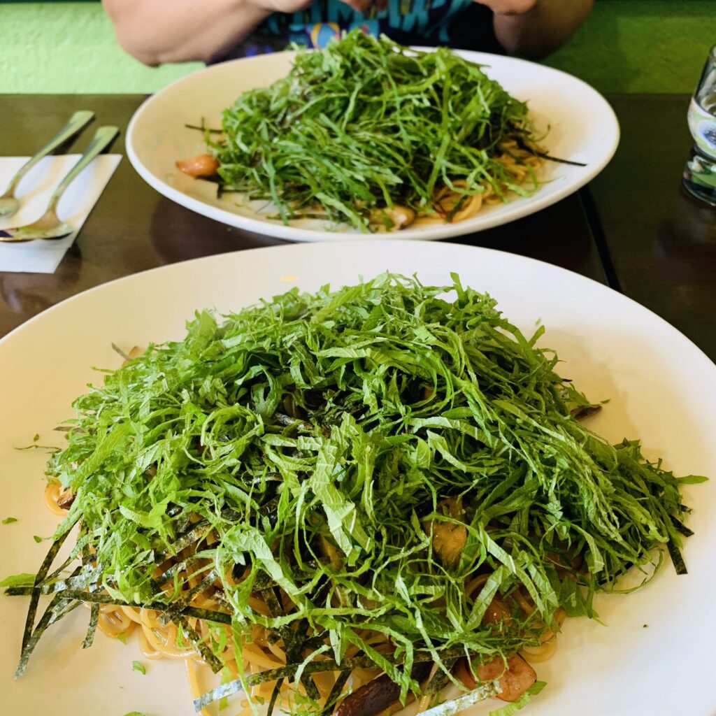This is today’s lunch. Green pasta was Perilla.